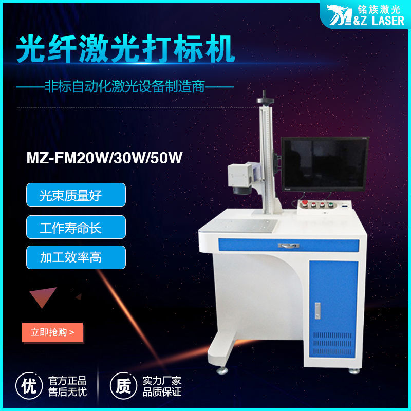 MZ-FM-20/30/50/100W-R光纖激光打標(biāo)機(jī)是我公司運(yùn)用現(xiàn)今世界上先進(jìn)的激光技術(shù)研制而成的新一代激光打標(biāo)機(jī)系統(tǒng)。采用武漢銳光纖輸出激光,再經(jīng)高速掃描振鏡系統(tǒng)實(shí)現(xiàn)打標(biāo)功能。光纖激光打標(biāo)機(jī)電光轉(zhuǎn)換效率高,達(dá)到30%以上,采用風(fēng)冷方式冷卻,整機(jī)體積小巧,輸出光束質(zhì)量好,可靠性高??傻窨探饘俨牧虾筒糠址墙饘俨牧?,主要應(yīng)用于對(duì)深度、光滑度、精細(xì)度要求較高的領(lǐng)域,如鐘表、首飾、模具行業(yè),位圖打標(biāo)等。